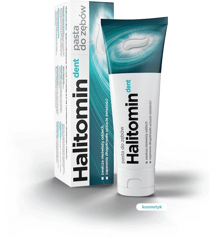 Halitomin dent to pasta do higieny i pielęgnacji zębów dla osób zmagających się z problemem nieświeżego oddechu tak zwaną halitozą. Mleczan cynku zawarty w recepturze pasty skutecznie wiąże lotne związki siarki, które są odpowiedzialne za nieprzyjemny zapach z ust natomiast diglukonian chlorheksydyny oraz ekstrakty roślinne z porostu islandzkiego i koszyczka rumianku mają właściwości antybakteryjne, dzięki czemu Halitomin dent ogranicza nieprzyjemny zapach z ust i daje uczucie świeżości na długo. Skład produktu został wzbogacony o enzym proteolityczny – bromelainę, która usuwa osad nazębny, przywracając zębom naturalną biel oraz chroniący zęby przed próchnicą fluor.