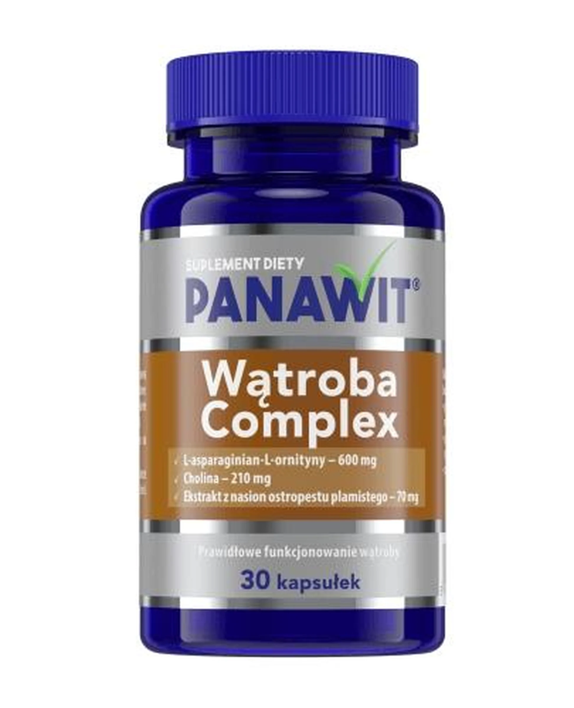 Panawit Wątroba Complex to suplement diety w formie kapsułek, zawierający L-asparaginian-L-ornityny, cholinę oraz ekstrakt z nasion ostropestu plamistego. Składniki produktu wspierają prawidłowe funkcjonowanie wątroby. Produkt dla osób dorosłych.